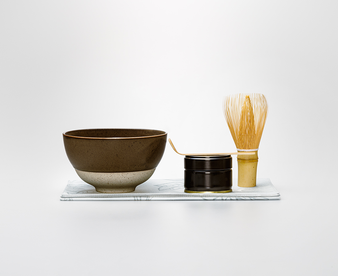 Compact set designed for the preparation and enjoyment of matcha. Contains a porcelain tea bowl, bamboo utensils and tea, along with a square cloth that allows for easy storage.